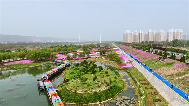 據了解,陳倉區渭河生態治理工程是渭河百里畫廊的重要組成部分,芝櫻花海以“生態優先、水美陳倉”為建設理念,以“何尊為首,花海為媒,千水環繞,水潤陳倉”為目標,著力打造的城市核心生態區?;êV醒虢ㄔO防汛瞭望塔、印象廣場和自然生態湖。防汛瞭望塔以“何尊”為模型,突出“看‘中國’,來寶雞”的青銅歷史元素,引來千河清水蜿蜒貫通園區,涵養并塑造出“堤固、水清、路通、岸綠、景美”的城市景觀。修建貫穿整個園區的3000多米的木棧道,展示“明修棧道、暗度陳倉”的歷史典故。種植芝櫻花3萬多平米,形成規?;幕ê>坝^,其中點綴園林、廊橋、步道、湖心島等景觀小品。每年4月芝櫻花海全部綻放,絢爛多姿,宛若紅云,已成為市民賞花游玩的網紅打卡地,年吸引觀光游客超80萬人。